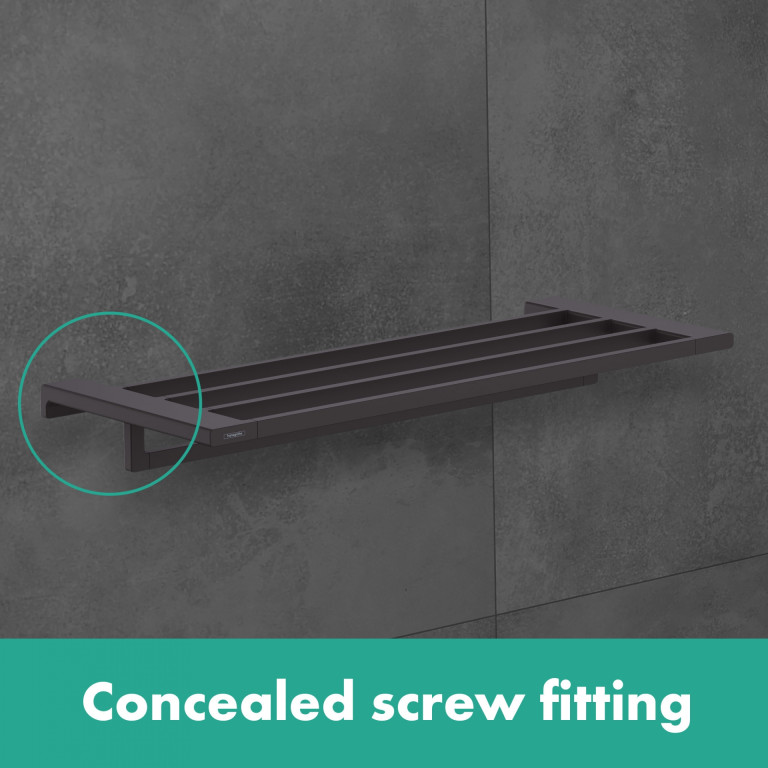 And the hansgrohe quality keeps the promises made by the premium design: THet AddStoris towel rack is made of metal, so it is made to last. This product is both a sustainable use of resources and it reduces the amount of plastic in bathrooms. The surface finish in a matt black colour is easy to clean and is one of the colour schemes in the range of hansgrohe special surface finishes for taps (FinishPlus). So everything can match perfectly.