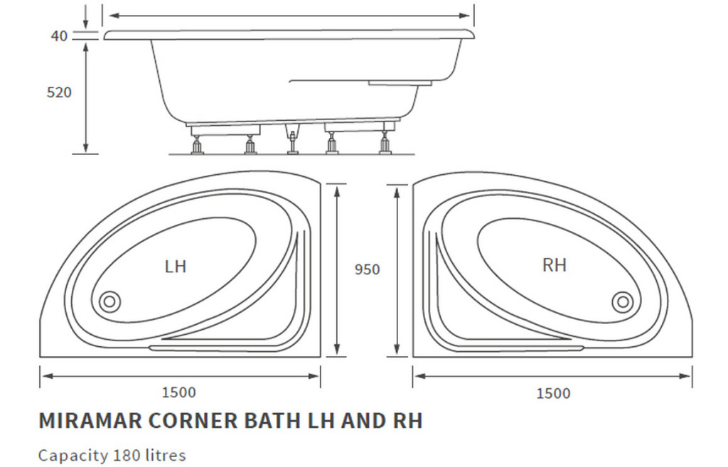 Pearl L Shape Supercast 1700X850X560mm 0 Tapholes Shower Bath Pack - Right Handed