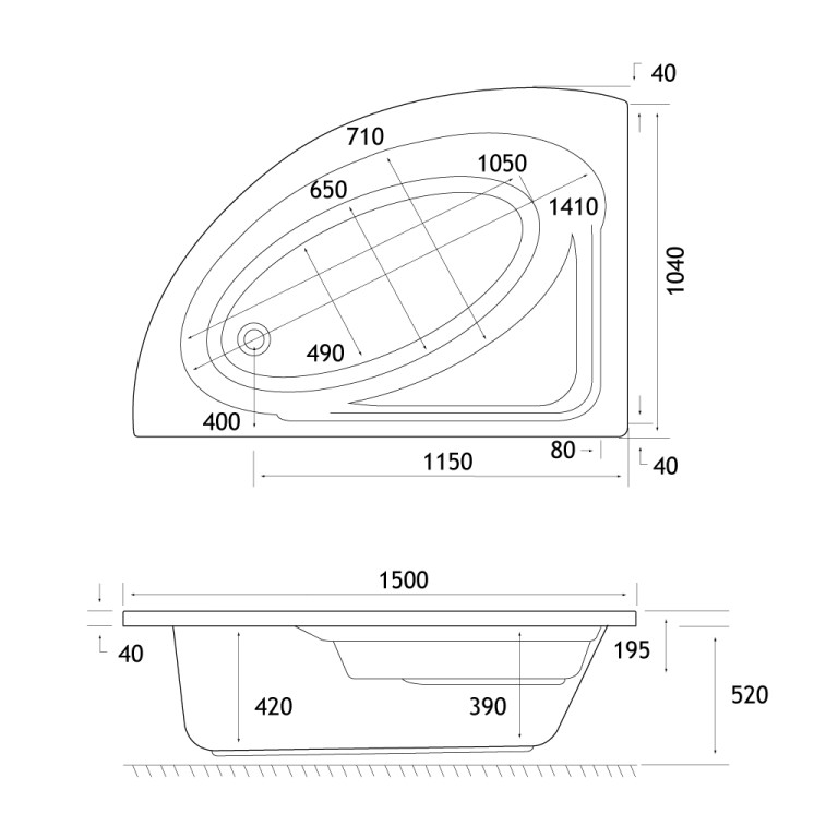 - Length: 1040mm, Width: 1500mm, Internal depth: 420mm, Height: 520mm