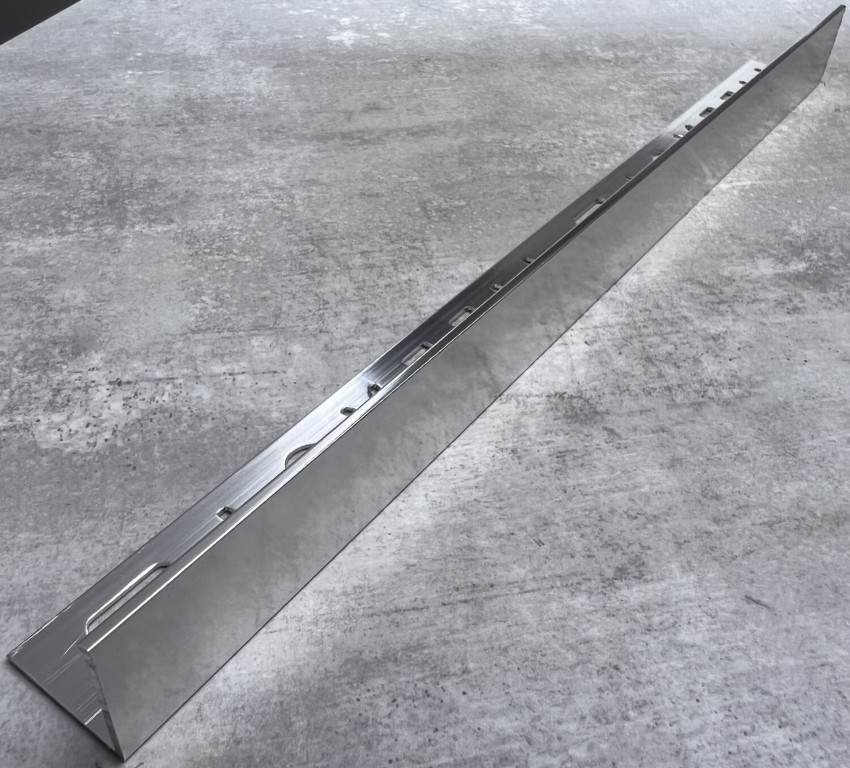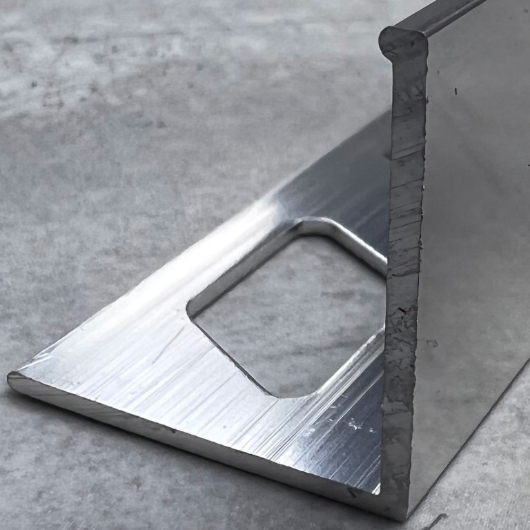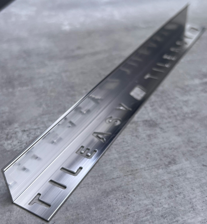 Straight metal profile to give a contemporary finish. Tiles sit under the lip of the trim and neatly abut the trim edge. Can be used outdoors.