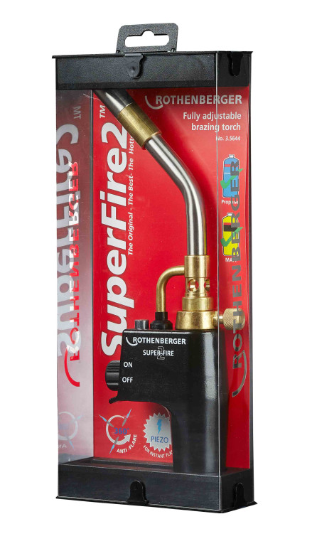 Super Fire 2 Torch is a market-leading soldering and brazing torch. Fast and effective, the Rothenberger Super Fire 2 Torch delivers a concentrated high-heat, anti-flare, adjustable flame with a powerful turbine flame pattern. The instant piezo ignition ensures the Rothenberger Super Fire 2 Torch will light safely and quickly, including when it is used upside down. Additionally, when fitted with an optional cool tip and filter jet (sold separately), the torch nozzle will remain cool even when the Rothenberger Super Fire 2 is on full power.