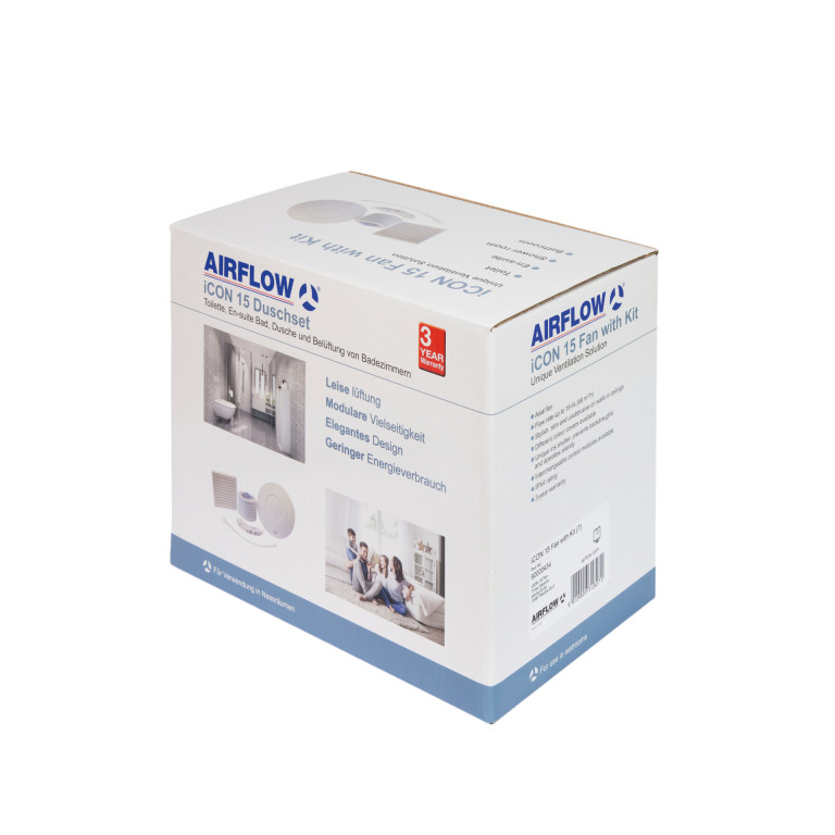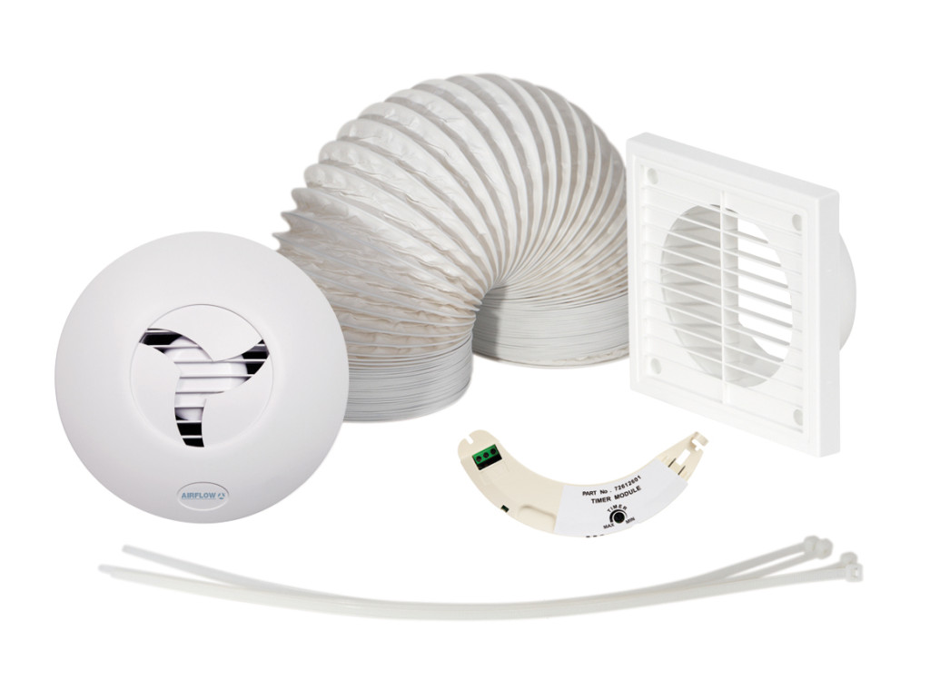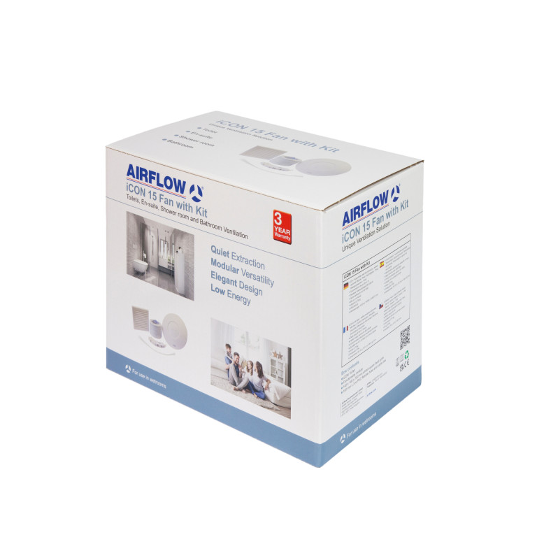 The iCON 15 Fan With Kit (T) is supplied with a Timer Module, a 140 x 140 x 100mm white square fixed grille, a 100mm x 3m PVC flexible hose and cable ties.