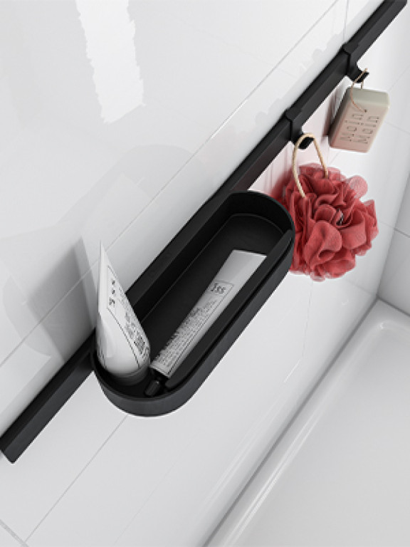 - Consists of: wall bar, storage basket, squeegee, towel hook