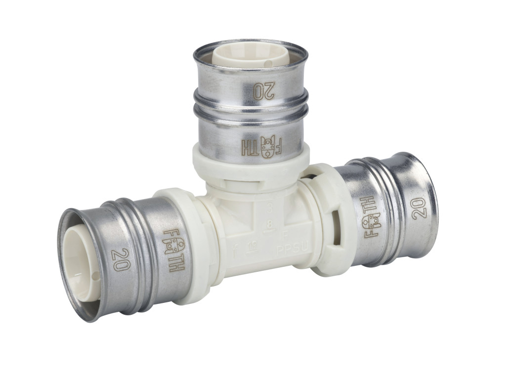 Tee made of PPSU for drinking water and heating system installations featuring white fixation rings with integrated inspection holes, fixed stainless steel pressing sleeves and leak function. Pressable with pressing contours F and TH.