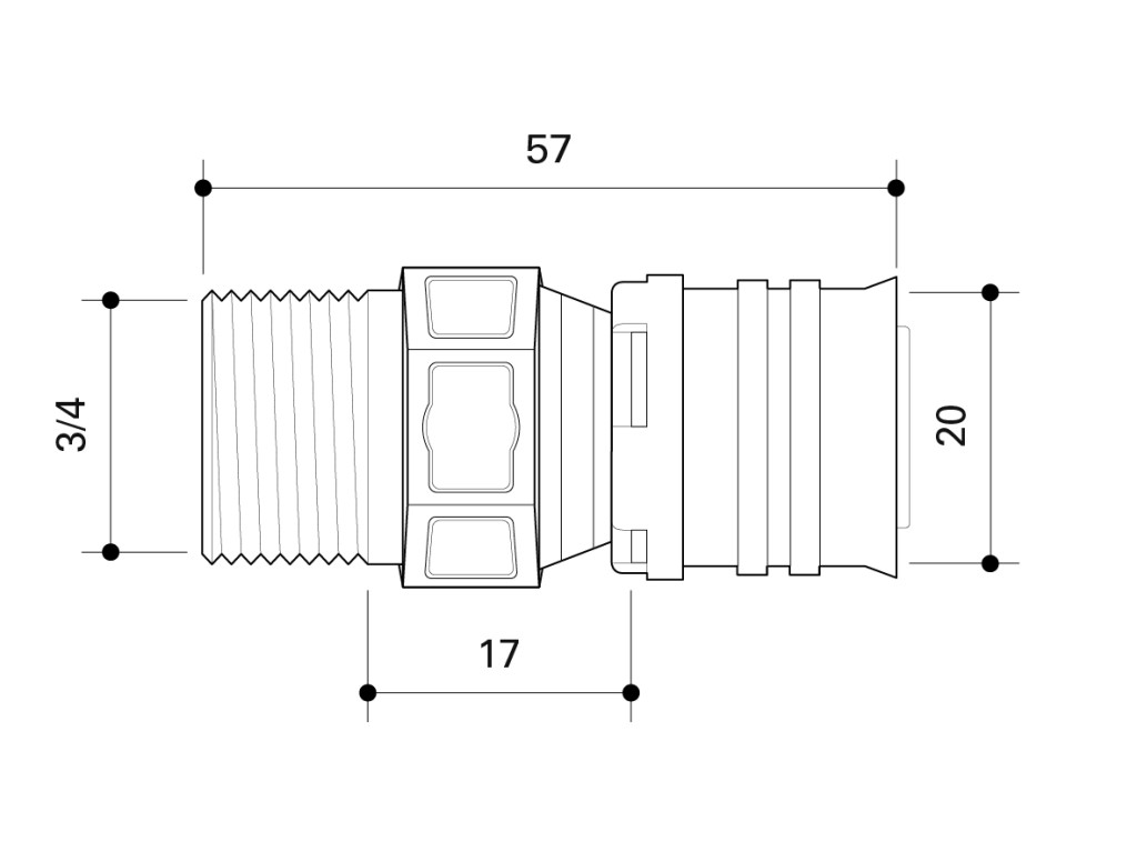 Male thread adapter according to DIN EN 10226-1 made of PPSU for drinking water and heating system installations featuring a white fixation ring with integrated inspection holes, fixed stainless steel pressing sleeve and leak function. Pressable with pressing contours F and TH.