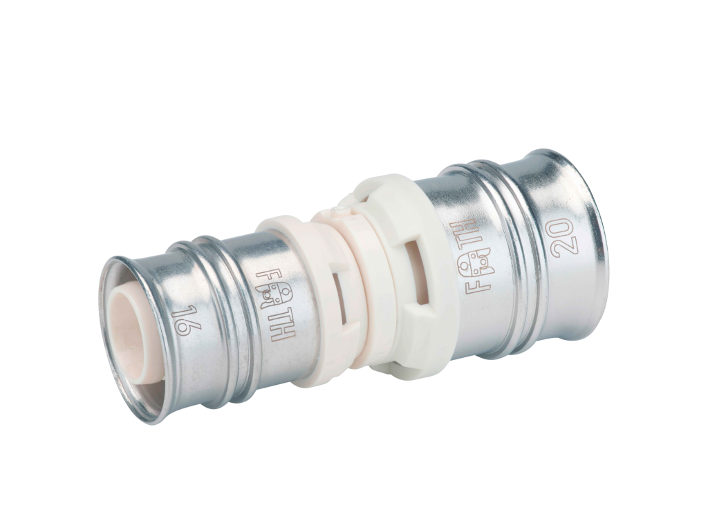 Reduced coupling made of PPSU for drinking water and heating system installations featuring white fixation rings with integrated inspection holes, fixed stainless steel pressing sleeves and leak function. Pressable with pressing contours F and TH.