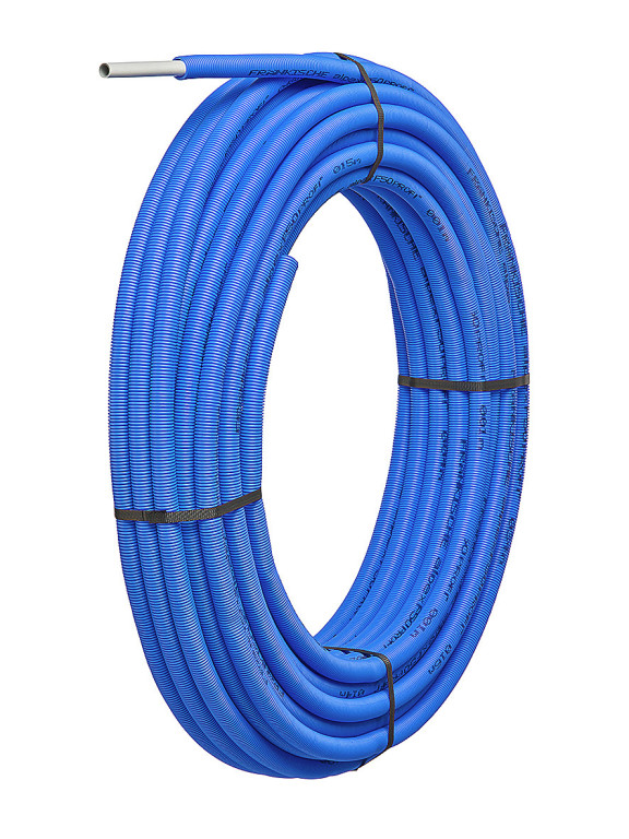 Multilayer composite pipe, colour: white, in coils made of cross-linked polyethylene (PE-Xb) as inner surface, longitudinally butt-welded aluminium pipe, and polyethylene of raised temperature resistance (PE-RT) as outer surface for drinking water and heating system installations, wrapped in PE-HD protective sheathing.