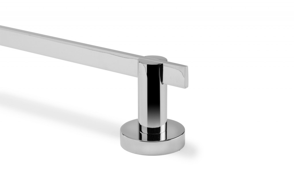 A blend of flat surfaces, curves and cylinders gives this modern towel rail that ‘metropolitan’ feel, perfectly complementing clean, cool bathroom hardware.